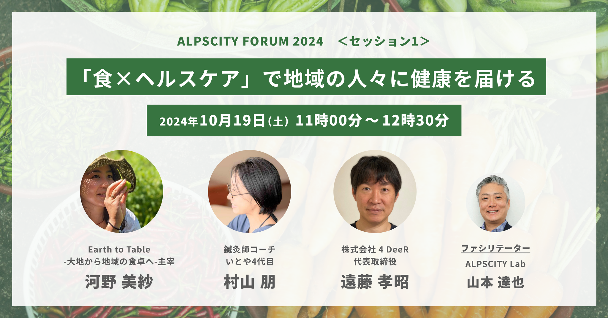 本セッションでは、「食べる」ことと地域とを掛け合わせながら活動を続けられているEarth to Tableの河野美紗さん、鍼灸師として東洋医学的な視点から地域の人々のヘルスケアに携わっていらっしゃる村山朋さん、耕作放棄地問題にも造詣が深く、地域×食でビジネスもされている遠藤孝昭さんをお迎えして、地域における「食×ヘルスケア」の現在と未来について考えていきます。