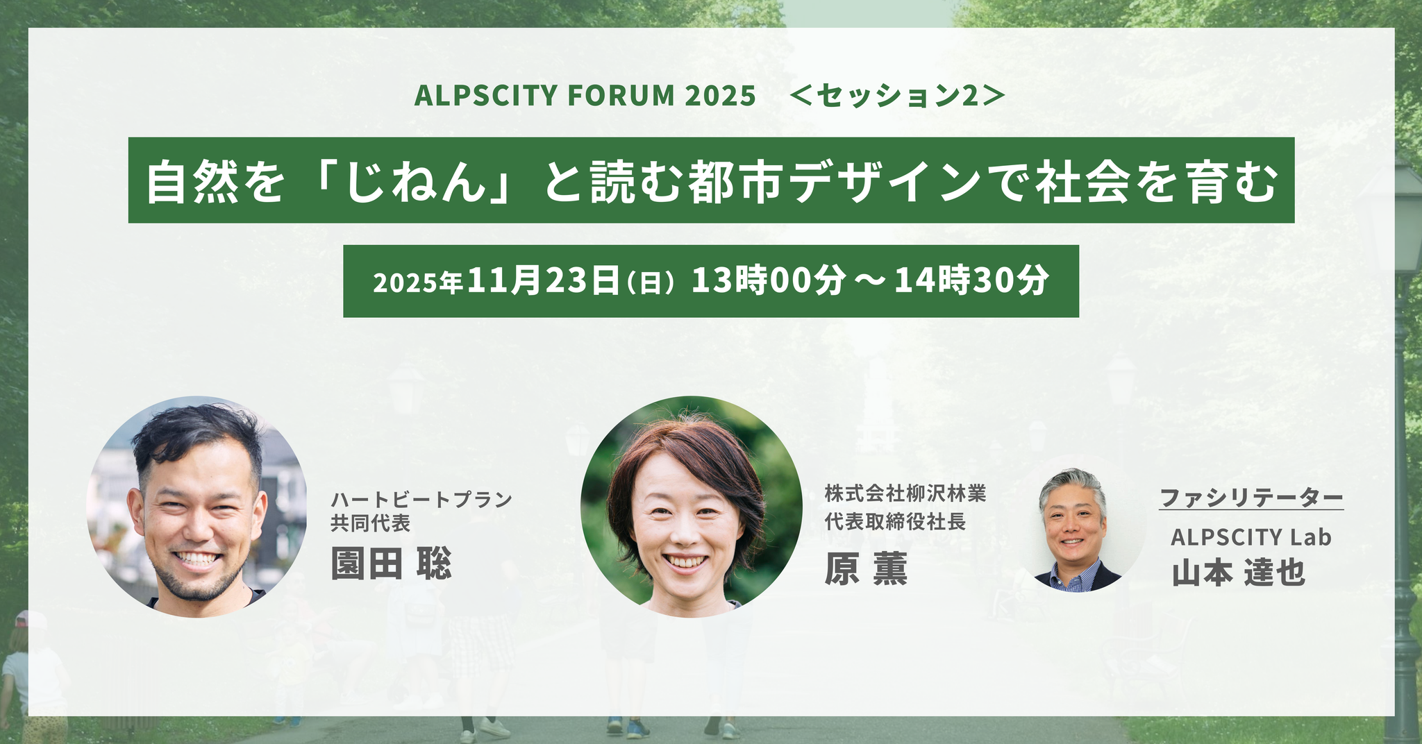 セッション登壇者は、松本市をはじめ様々な街の「都市デザイン」を手がけていらっしゃる園田聡さんと、「じねん」の感覚を大切にしながら山と人との共生を追求し続けている原薫さんをお迎えします。ファシリテーターは、ALPSCITY Labの山本達也。