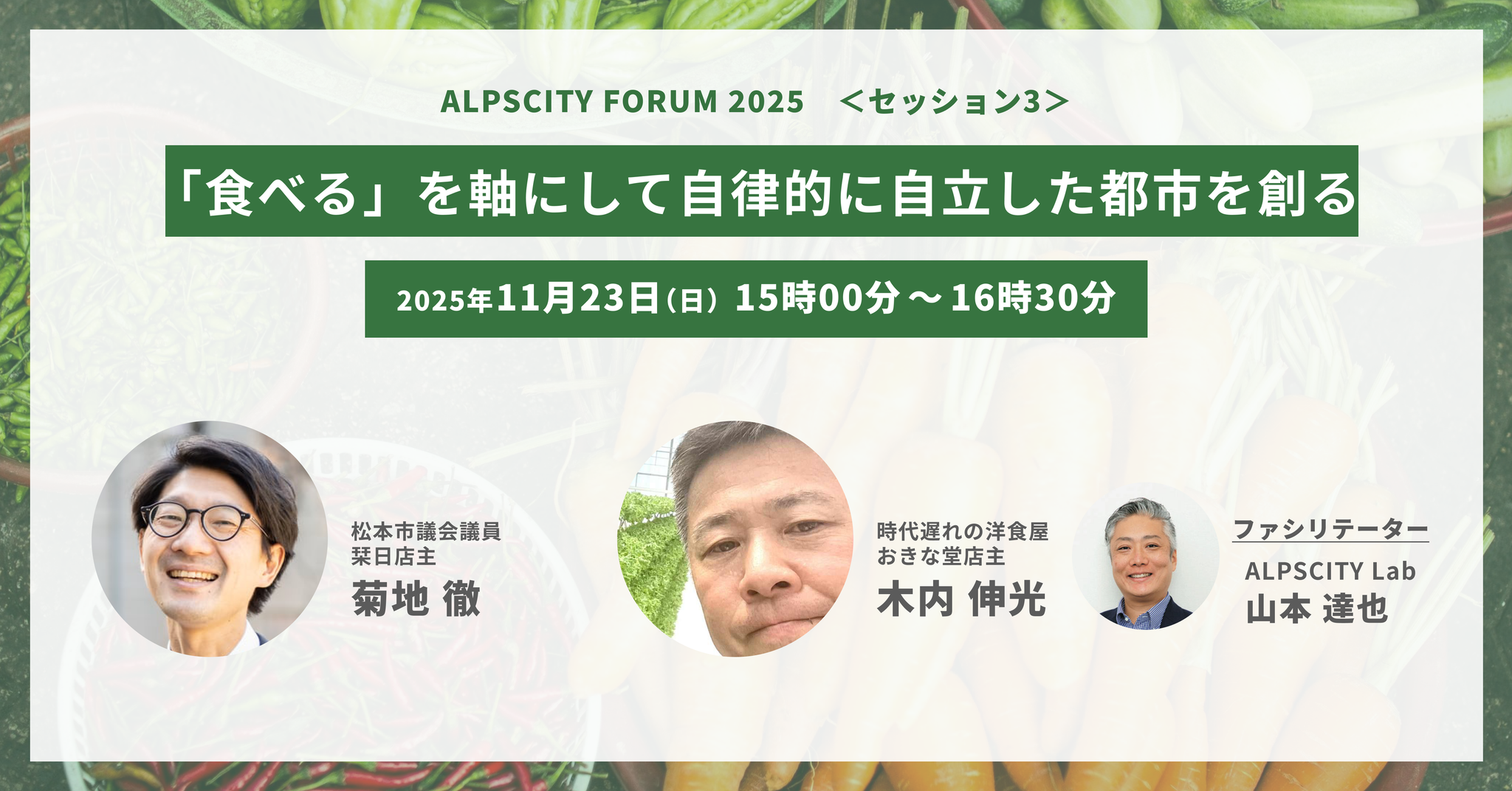 本セッションでは、都市が自律的・自立的に「食べる」仕組みづくりに焦点を当てます。地元生産者や飲食店、学校や福祉施設、商業者、そして市民がゆるやかにつながり、地域内で食の価値が循環するとき、都市は新たな強さとしなやかさを獲得します。このテーマは、コミュニティ形成や地域経済の再生、災害時のレジリエンス向上にもつながる可能性を秘めています。